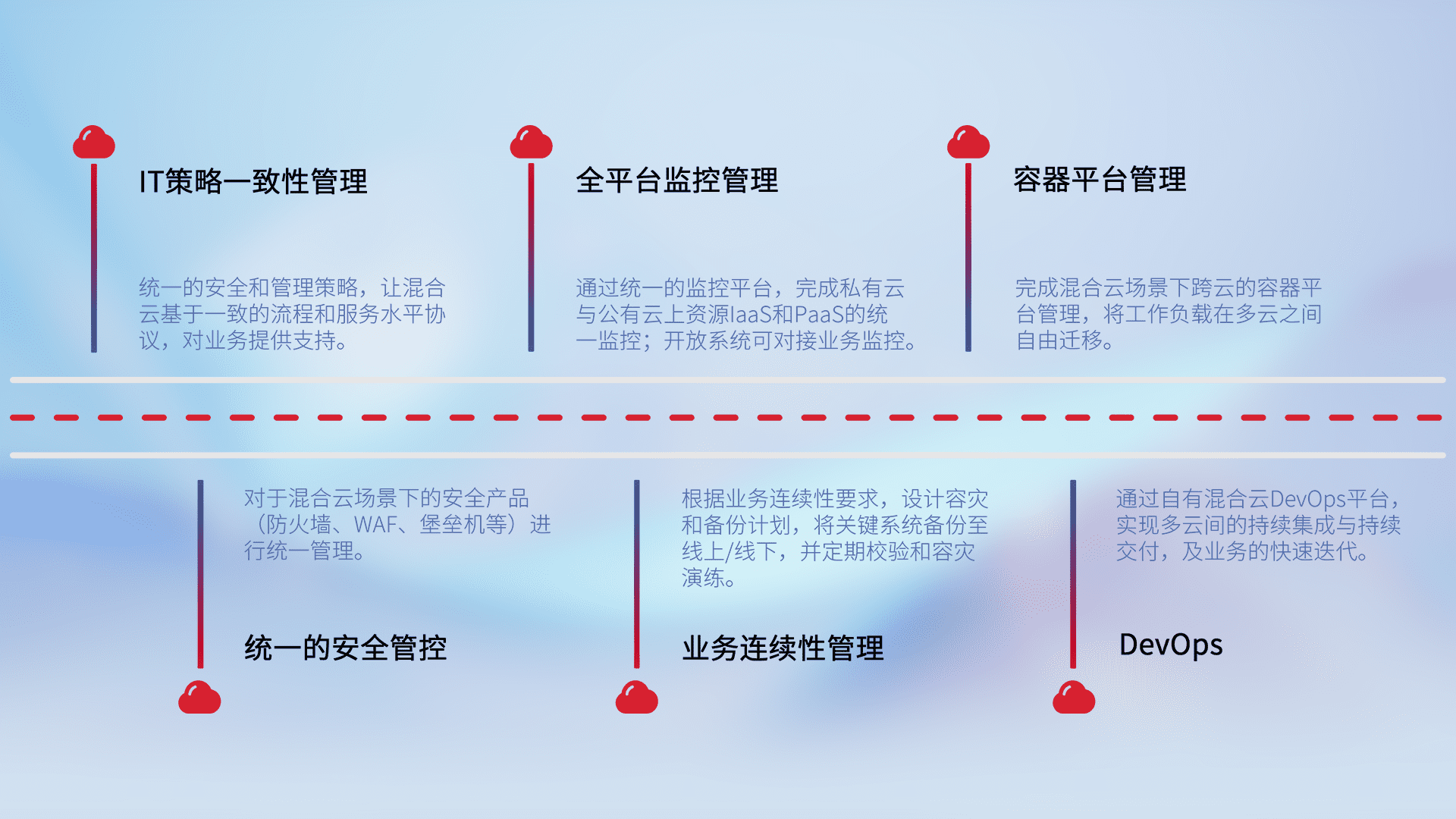 通过多云纳管,,,以统一的资源数据模型把客户的云资源进行抽象和封装,,,,进而实现对多云资源的统一操作,,,保障云资源管理的可靠性、、稳定性与可用性。。。量身定制化运维内容,,,,配置、、开发运维、、补丁管理、、备份、、、、监控、、认证和访问管理、、、、审计和日常巡检等,,,,保障在用云过程中的可靠度,,,稳定度以及高可用率。。。