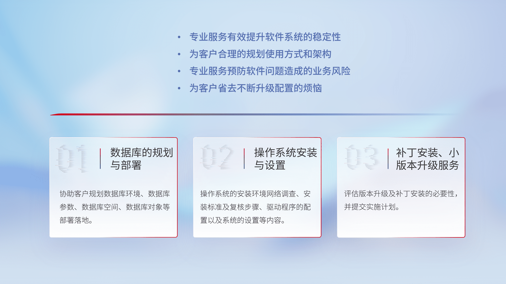 为客户提供软件规模升级、、、快速部署、、、、按需配置的专业服务,,,从数据库的规划与部署到操作系统的安装与设置,,,再到补丁安装和小版本升级提供支持。。。